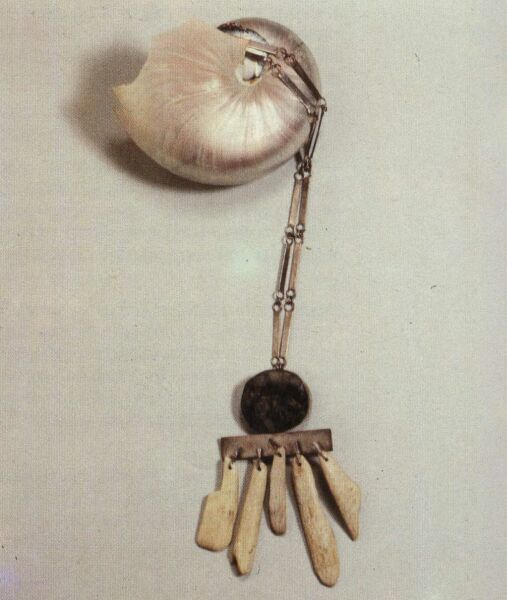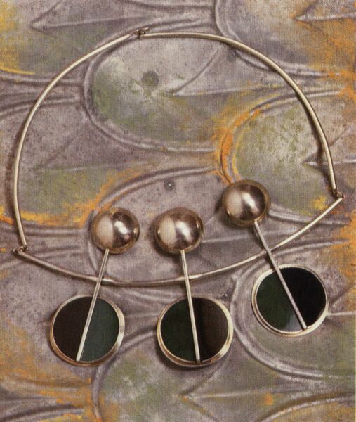 Silver, with three discs of onyx, half green, half black and three semi-spheres